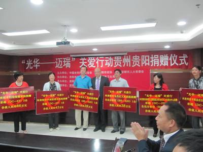 7月25日上午,基金会向贵阳、安顺两地6所医院共捐赠价值313.2万元的医疗设备,捐赠仪式在贵阳市卫生局举行。基金会副秘书长查德荣、深圳迈瑞生物医疗电子股份有限公司国内营销系统副总裁冀强、贵阳市政协副主席孙袁、贵阳市卫生局党委书记卢幼黔、安顺市人大常委会常务副秘书长何晓东、平坝县卫生局党委书记梁明芝等领导和嘉宾出席捐赠仪式。捐赠仪式由贵阳市卫生局调研员先丽华主持。